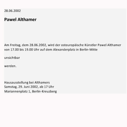 | Als Abschluss seines einjährigen Aufenthaltstipendium am DAAD in Berlin 2002, lud Althamer zu einem Vortrag ein, der reflektieren sollte, wie er sich in der Kunstszene nicht wahrgenommen fühlte. Die Arbeit mit dem Titel "Unsichtbar" bestand aus Werbeplakaten, die eine Aktion auf dem Alexanderplatz ankündigten: «Am Freitag den 28.6.2002 wird der osteuropäische Künstler Pawel Althamer von 17.00 bis 19.00 Uhr auf dem Alexanderplatz unsichtbar werden» Althamer blieb während der Aktion zuhause in seiner Wohnung, hielt aber dennoch Wort: Denn die Plakate waren in einer rasch verblassen Sonderfarbe gedruckt gedruckt |