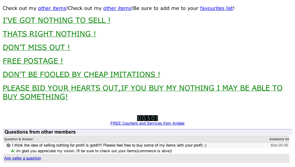 Untitled (collecting nothing). 2005-2006 2. OG | A | "Ich habe eine Zeit lang verschiedene Angebote von "nichts" auf ebay gekauft. Das war allerdings etwas heikel, da der Verkauf von "nichts" eine Verletzung ihrer Nutzungsbedingungen darstellt. Viele Verkäufer schrieben ihr Angebote als Witz aus und waren ziemlich besorgt, dass ich nicht verstand, dass sie mir wirklich "nichts" verkaufen würden. Manchmal schickte ich ihnen das Geld und damit war der Handel beendet. Andere Male wurde mir ein leerer Kasten oder Umschlag geschickt. Und manchmal wurden mir Sachen zugeschickt, die "Nichts" abbildeten oder kommentierten." (Randall Szott) |