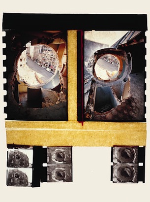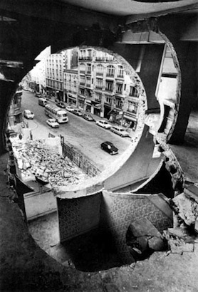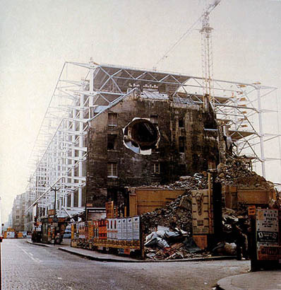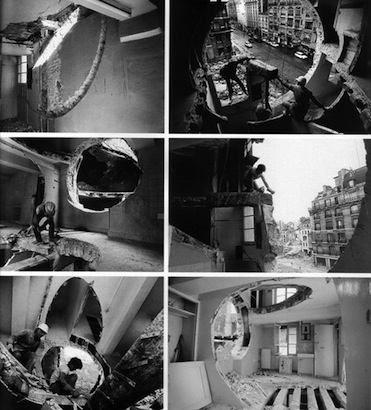 Conical Intersect, 1975. EG | B | Building Cuts, Rue Beaubourg 27-29, in Paris. Dokumentationsfilm: 1975, Kamera: Bruno Dewitt, Gordon Matta-Clark. Conical Intersect war Matta-Clark's Beitrag zur Biennale von Paris von 1975: Er machte einen riesigen Schnitt durch zwei Gebäude des 17. Jahrhunderts, die für das im Bau befindliche Centre George Pompidou abgerissen werden sollten. Der Schnitt hatte die Form eines Tornadokegels, der sich spiralförmig bis zur Decke wand und den Passanten einen Einblick wie durch ein Periskop in die Eingeweide der Gebäude bot. Mit der kontrollierten Zerstörung der Gebäude schuf Gordon-Matta eine Art Anti-Mahnmal, das die problematischen Folgen der Gentrifizierung der Stadt sichtbar macht. Gleichzeitig geht von dem klaffenden Löchern und Schnitten eine betörende Schönheit aus, die sich in den Dokumentationsfilmen und -fotografien bis heute erhalten hat, während die Gebäude selbst längst abgebrochen sind. | |