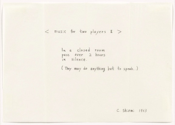 music for two players II, 1963. EG | B | Bleistift auf Papier, 17.7 x 25.3 cm. Musik für zwei Spieler II Verbringen Sie 2 Stunden in einem geschlossenen Raum in Stille. (Sie dürfen alles tun ausser reden) | |