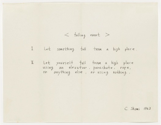 Falling event, 1963. EG | B | Bleistift auf Papier, 17.6 x 22.8 cm. Die Künstler wurden dazu aufgefordert, einen Gegenstand fallen zu lassen und einen Bericht darüber zu verfassen: So liess etwa die Künstlerin Shigeko Kubota eine kleine rote Blume aus einem Fenster in New York fallen, der littauische Pianist Vtautas Landsbergis liess einen Hecht in eine Bratpfanne fallen und der tschechische Künstler Ladislav Novak behauptete gar, ein Kleinkind von einem Hügel geworfen zu haben … | |
