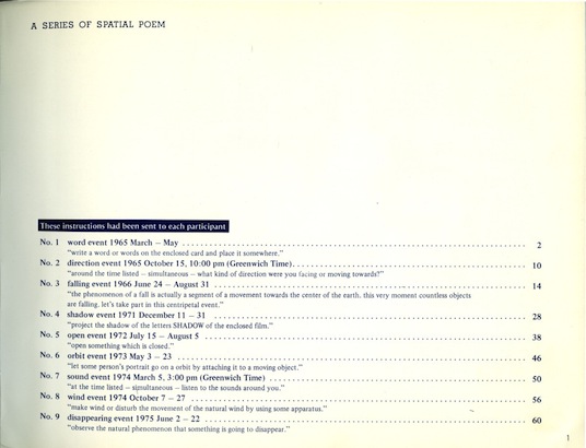 spacial poem Nr. 9: disappearing event, 1975. EG | B | "Beobachte das natürliche Phänomen, dass etwas verschwinden wird" ("observe the natural phenomenon that something is going to disappear"). 1965 begann Mieko Shiomi eine Serie von neun grenzüberschreitenden Fluxus-Events, die sie Spatial Poems nannte. Sie lud zahlreiche Künstler aus der ganzen Welt dazu ein, minimale Aktionen in Form von Eingriffen in die Umwelt zu realisieren – z.B. ein Wort auf eine Karte zu schreiben und einen Ort auszuwählen, wo die Karte deponiert wird. Die Teilnehmer dokumentierten ihre Interventionen und schickten das Material Shiomi, die daraus verschiedene Fluxus-Objekte und Installationen schuf, andererseits eine Publikation zusammenstellte. | |