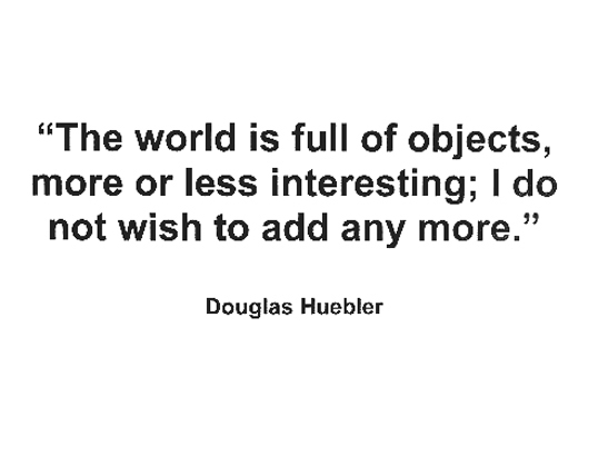The world is full of objects, more or less interesting; I do not wish to add any more, 1969. UG | A | "Die Welt ist voll mit Dingen, die mal mehr, mal weniger interessant sind; Ich möchte keine neuen hinzufügen" – dieses Statement war Huebler's Beitrag zu der von Seth Siegelaub kuratierten Konzeptkunst-Gruppenausstellung (January 5-31, 1969 – Barry, Huebler, Kosuth, Weiner) mit Werken von Joseph Kosuth, Robert Barry, Douglas Huebler und Lawrence Weiner. | |
