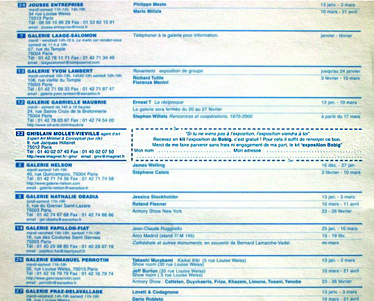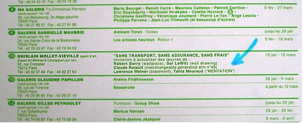Sans transport, sans assurance, sans frais, 1994. UG | A | "Im Programm der Galerien bestand meine Ausstellungsankündigung darin, dass ich sagte, dass jeder, der eine dieser konzeptionellen Arbeit installieren wolle, dies bei sich zu Hause tun könne – ohne Transport, ohne Versicherung, ohne Kosten." (Ghislain Mollet-Viéville) Die folgende Ankündigung wurde im Galerienprogramm Mode d'emploi im Januar 1994 abgedruckt: "Ohne Verkehr, ohne Versicherung, ohne Kosten. Einladung zur Aktualisierung von Werken von Robert Barry (Wandstück), Sol LeWitt (Wandzeichnung), Lawrence Weiner (Aussage), Tania Mouraud ('Umsetzung')" | |