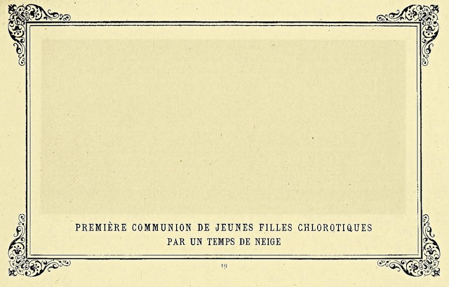 Première communion de jeunes filles chlorotiques par un temps de neige (Erstkommunion junger bleichsüchtiger Mädchen bei Schneetreiben), 1883. UG | B | Publiziert im Album primo-avrilesque, Paris 1897. Paris 1897. 1 Seite, 12×18.5 cm