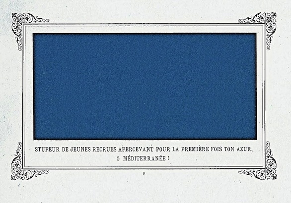 Stupeur de jeunes recrues de la Marine en apercevant pour la première fois ton azur, o Méditerranée! (Das Erstaunen junger Rekruten, als sie zum ersten Mal dein Azur sehen, o Mittelmeer!), 1897. UG | B | Publiziert im Album primo-avrilesque, Paris 1897. Paris 1897. 1 Seite, 12×18.5 cm