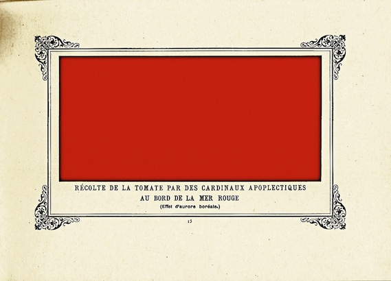 Récolte de la tomate par des cardinaux apoplectiques au bord de la mer Rouge (Tomatenernte apoplektischer Kardinäle an den Ufern des Roten Meeres), 1884. UG | B | Publiziert im Album primo-avrilesque, Paris 1897. Paris 1897. 1 Seite, 12×18.5 cm | |