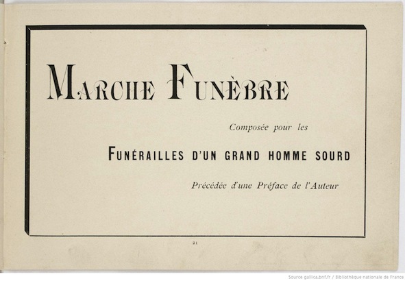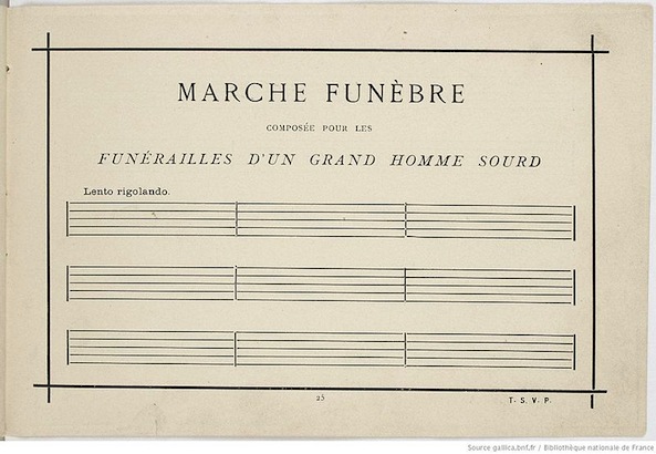 Marche funèbre composée pour les funérailles d'un grand homme sourd (Trauermarsch für die letzte Ölung eines tauben Mannes), 1897 UG | B | Ein Musikstück, das komplett aus Stille besteht. Publiziert im Album primo-avrilesque, Paris 1897. Paris 1897. 3 Seiten, je 12×18.5 cm | |