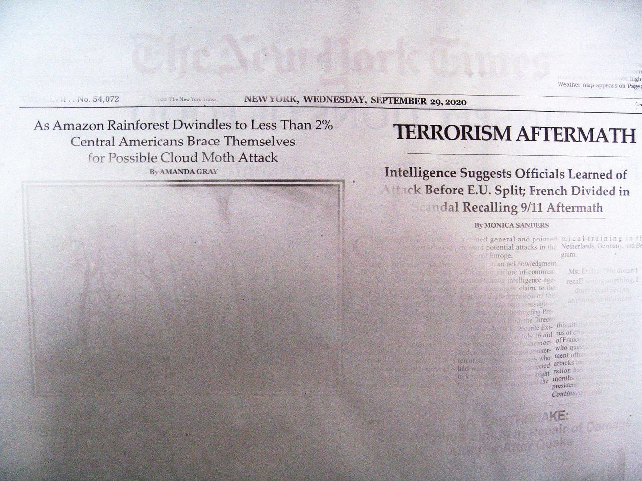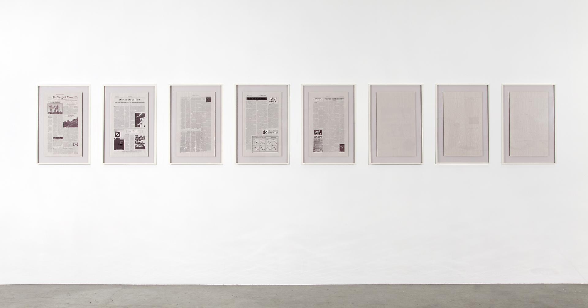 | Thermochromic ink silkscreen on newsprint, 8 framed pages, 57 x 37.5 cm (each image), 73.3 x 37.5 cm (each frame), edition of 3 (2 signed). A version of The New York Times from the year 2020. A professional clairvoyant who collaborates regularly with Interpol, police, and governments, and who is a reliable source of information for businessmen and politicians, was asked to create a forecast of what will happen in and around 2020. The forecasts were later developed into an issue of The New York Times with articles written by several NY Times journalists and other ghostwriters. The newspaper has all the specs of The New York Times, from a bar code to advertisements bought by existing companies. It is, however, printed with disappearing ink, which becomes completely invisible above 18 degrees and comes back to black only when it is cooled down. As a result, the newspaper appears and disappears depending on weather conditions and the temperature of the room, or when touched by human hands, which warm up the paper. | |