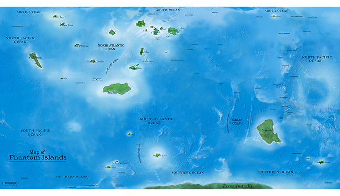 Map of Phantom Islands, 2011. 2nd | A | Thermochromic print on paper, 100 x 70 cm. Map of Phantom Islands is a map of the world. With only fictional islands marked, all other continents were removed, thus creating a map of imaginary territories where colonial influences and power relations can also easily be shown. The maps depict all the phantom islands that during the history of civilization were ever shown on maps of the world as a result of cartographic errors, misconceptions about the world, rumors, myth, and legends, or Fata Morganas and mirages observed in different places around the globe. Some phantom islands were also intentional errors made by explorers who tried to persuade governments to provide money for conquering new lands by inventing and placing some nonexistent territories on maps; these inventions continued to appear on other maps over the centuries. All these islands gradually disappeared from maps over time, as cartography improved, though some islands continued to appear as late as 1943, with others still occasionally reappearing to this day. Bermeja, for example, is a tiny phantom island that the United States still places on manipulated versions of Google Earth maps, perhaps as a potential source of conflict with Mexico, since the island is supposed to have oil resources. | |
