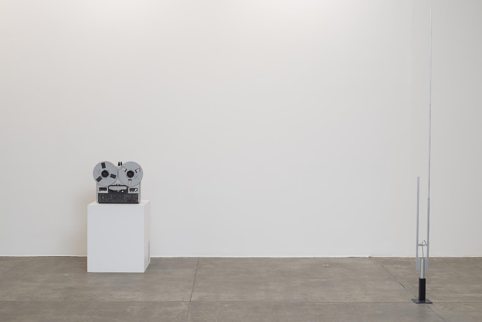 103.1 (title variable), 2012. 2nd | A | 103.1 (title variable), 2012. Custom-made antenna (260 x 15 x 15 cm), 1 watt broadcaster (117 x 60 x 60 cm), sound mixer, loudspeakers, reel-to-reel player, radio (104 x 48.5 x 17 cm), custom pedestal. An edition of 3 (2 signed). The sound piece consists of an accumulation of silent pauses from important political, intellectual, and economic speeches from the beginning of voice recording to the present day. The work was inspired by a short story, "Murke's Collected Silences" (1955), written by one of Germany's foremost writers of the 20th century, Heinrich Böll. Presented as a radio transmission from a reel-to-reel tape player, 103.1 (title variable) highlights editing as a creative process, but also brings forward Kurant's interest in phantom art, as Böll's story revolves around a sound editor who makes a recording of silent pauses. | |