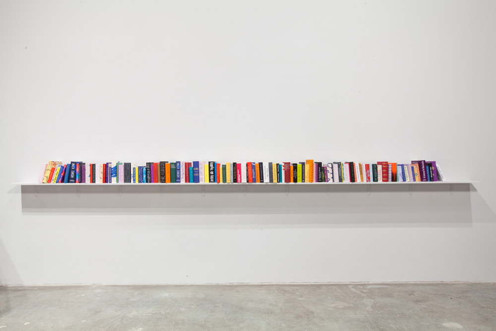 Phantom Library, 2011-ongoing. 2nd | A | Embossed canvas, silkscreen on paper and cardboard, thermochromic pigment on paper, gold leaf, silver leaf, offset print on paper, custom shelf. The Phantom Library takes up imaginary books included in novels by authors like Philip K. Dick, Roberto Bolaño and Jorge Luis Borges. Some are mentioned in passing, others more fully fleshed out. Kurant turns these specters of the literary canon into real, marketable goods, creating physical books, each of which has an ISBN number and bar code, but flip through them and there’s nothing – just blank pages. Kurant uses established information about each book to create a book jacket summary and manufactures each book using a mass printer, making each work not so much a precious sculpture as a mass produced, marketable good. For the second stage of the project, Kurant has enlisted real authors to actually physically write the imaginary books. "I'm interested in this idea of thinking of works as living organisms that have certain agency and autonomy. After they are created there is some kind of transformation, and freeing themselves from their authors – there is a loss of control over the works," said Kurant. Though they may not be completed for years, the imagined books will eventually sell at local bookstores with all the regular, non-fiction novels, retroactively giving material shape to the book-shaped ideas created in the minds of Borges et al. years ago. | |