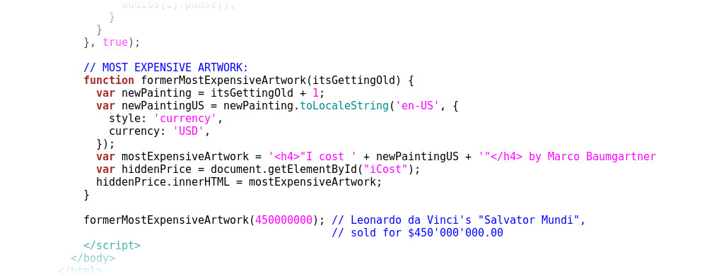 I cost $450,000,001.00, 2018 2nd | A | Notice by the artist: "Take the most expensive painting ever sold and add one Dollar to its price. What you get is the price of an even more expensive painting. Now, that we got the price, who does the painting? I do! I do the the painting - you do the buying. Here's how it works: Whenever a painting gets sold for a new record breaking price, I will put up for sale a new "I cost [...]" painting for that very price - plus one US-Dollar. The newly calculated price is merged with the paintings name, so it reads: "I cost $450,000,001.00" (current "I cost [...]" painting for sale, based on Leonardo Da Vinci's "Salvato Mundi" sold for $450'000'000.00). Material: I paint on A4-sized photocopy paper (random brand). Weight is 80g/m2, but may vary +/- 100%. I always go for -100%. So it's going to be a paper of zero weight. Obviously I can't paint onto this. So I won't. This means: the final painting only consists of its name - and that fact that you are paying for it. It's going to be a bank-transfer-only-painting. But - and this is the important part - it's going to be the most expensive painting ever sold (in case of purchase). And you're going to be the proud owner of it (if you're going to buy it). I can't guarantee that you'll be the proud owner of the most expensive painting ever sold for ever. Actually, the only thing I can guarantee, is, that it's going to be the most expensive painting ever sold while you're buying it. Keep in mind, that the time span of buying (transferring money) isn't long at all. We're talking about something like zero seconds. But then again: I don't expect to sell an "I cost [...]" painting every day. So, the record will probably last for some time, although I'll try my best to disappoint you: After purchase, there will be a new "I cost [...]" painting for sale, which in turn, is going to be even more expensive. This story is not meant to end. Let's recap: You're about to buy a painting which consist of its name only. You're getting nothing in return except the name of the painting (which you know already). I'm going to send you a bill (PDF, via email), you pay, I confirm your payment - that's it. Just to make sure: - No weight - No size - No mass/matter, what so ever - It's just the name (and its remarkable price, of course) Still want to see something? Exhibited in the No Show Museum is the Javascript function, which generates the "I cost [...]" painting, based on the price of the current most expensive painting ever sold. Contact me at info@marcobaumgartner.com if you're interested in buying this painting. Please contact me also, if you hear of some new "most expensive painting ever sold", so I can adjust my pricing. Thanks." | |