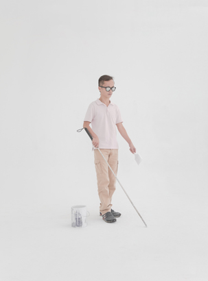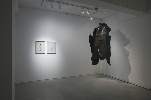 | Photographs and leather, installation. The two photographs introduce the artist as a blind man, painting white in an all-white space. He doesn‘t know that he is in a white space, nor does he know the color of the paint on his hands, he just keeps repeating the action of covering. This is how Niu Jun Qiang sees his situation as a visual artist within the contemporary art world. When the artist was a volunteer at the Institute for the Blind of Taiwan in 2015, he asked twelve blind people, what do they think he looks like? Their feedback was in a non-visual way describing his appearance by sounds, smells and spatial movement. The artist later translated their descriptions to Braille and engraved them on 12 leather pieces, the size equal to his body’s height and width. Like this, the engraved leather pieces became a visible yet unintelligible sculpture for people who can't read the Braille words, whereas only the visually impaired people can "see" beyond the superficial appearance and understand the true meaning of this sculpture by touching. In its dialectic between the visibility and invisibility, the work invites us to reflect on our common notions of an artwork and its appearance. | |