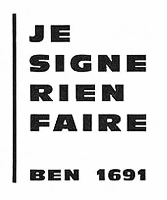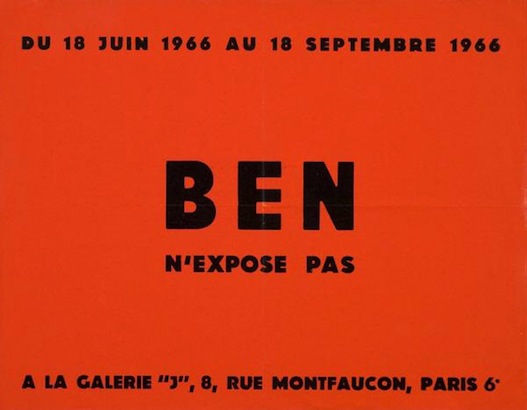 BF | A | Poster of the exhibition in the gallery "J" in Paris, with the announcement that Ben will not exhibit – from July 18 to September 18, 1966 in the gallery "J" in Paris. | ||