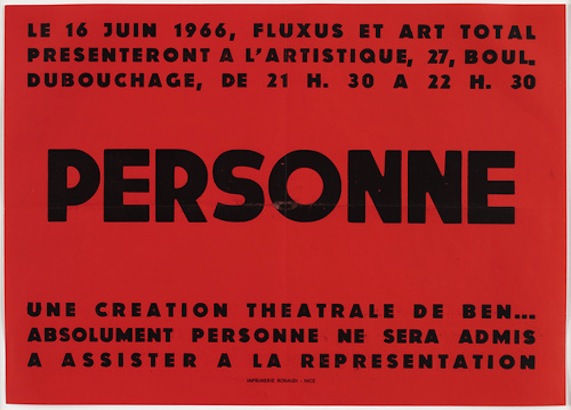 Premiered in Nice. An avant-garde theater piece by Ben Vautier, presented by Fluxus and Art Total, which no visitors were allowed to see. The actors peformed in front of empty rows. It was not until the fall of the curtain that the actors joined the audience in the waiting hall. | ||
