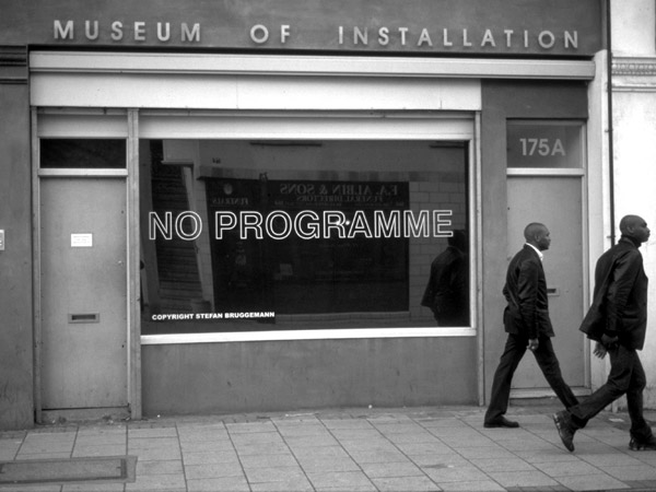NO PROGRAMME, 2001. BF | A | Installation in London. White vinyl lettering on display window. Font: Arial Black outline.