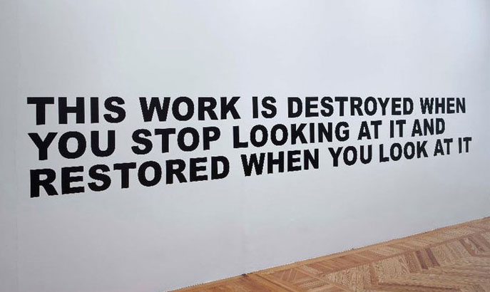This work is destroyed when you stop looking at it and restored when you look at it, 2011. BF | A | Black adhesive vinyl lettering on wall. | |