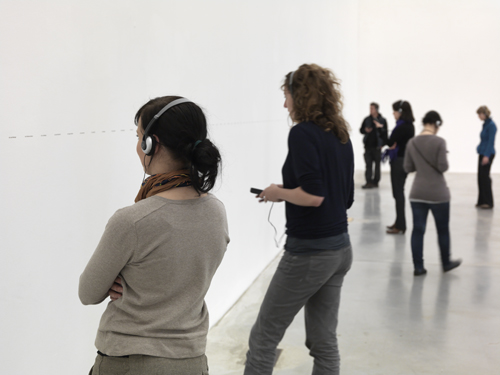 Zeigen. Eine Audiotour durch Berlin (Zeigen. An Audio Tour Through Berlin), 2009. GF | A | A series of projects developed by the artist for specific arts institutions or particular locations. In this project, Sander invites fellow artists associated with the place or institution to contribute one work to the exhibition. However, the submitted work should be translated into an acoustic piece. The invited artists were free to define both the nature of sound (a description, noise, reading, singing, music, etc.), as well as the duration of the audio piece that serves as an audible representation of their visual works of art. The Zeigen exhibition space was left empty, except for the uniform black lettering on the wall listing the names of the participating artists and numbers for the audio guide. Visitors were issued an audio guide that allowed them to listen to each sonic work on display. The project brought attention individual modes of perception and different ways of communicating a work of art. In German, the word 'zeigen' means 'to show'. In Zeigen, a visual representation, common to the exhibition context, is replaced by an audible impression, which serves both as a statement of a given artist and as a catalyst of the viewer's – now listener's – imagination. Through a conceptual gesture of translating one medium into another, the work is dematerialized and transformed in a sonic piece that offers a variety of alternative perceptual and narrative experiences. At the same time, filling the empty space, the figures of the listening visitors become part of the exhibition's setting. Zeigen can also be viewed as an immaterial collection of works of art assembled for a particular location. (7) | ||