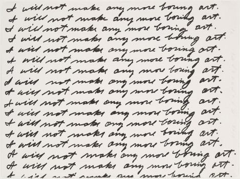| Título original: I Will Not Make Any More Boring Art Vídeo, 31:17 min / litógrafo, 57 x 76.4 cm En 1971 realizó este vídeo en el que durante treinta minutos se ve al artista escribiendo la frase „No voy a hacer más arte aburrido“ una y otra vez, emulando una conocida forma de castigo escolar. | |