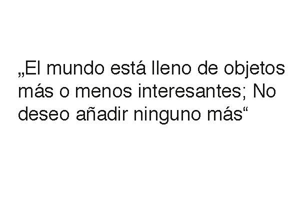 The world is full of objects, more or less interesting; I do not wish to add any more, 1969. SO | A | Esta declaración fue la contribución de Huebler a la exposición del grupo de arte conceptual (5-31 de enero de 1969 - Barry, Huebler, Kosuth, Weiner) comisariada por Seth Sielaublaub con obras de Joseph Kosuth, Robert Barry, Douglas Huebler y Lawrence Weiner.